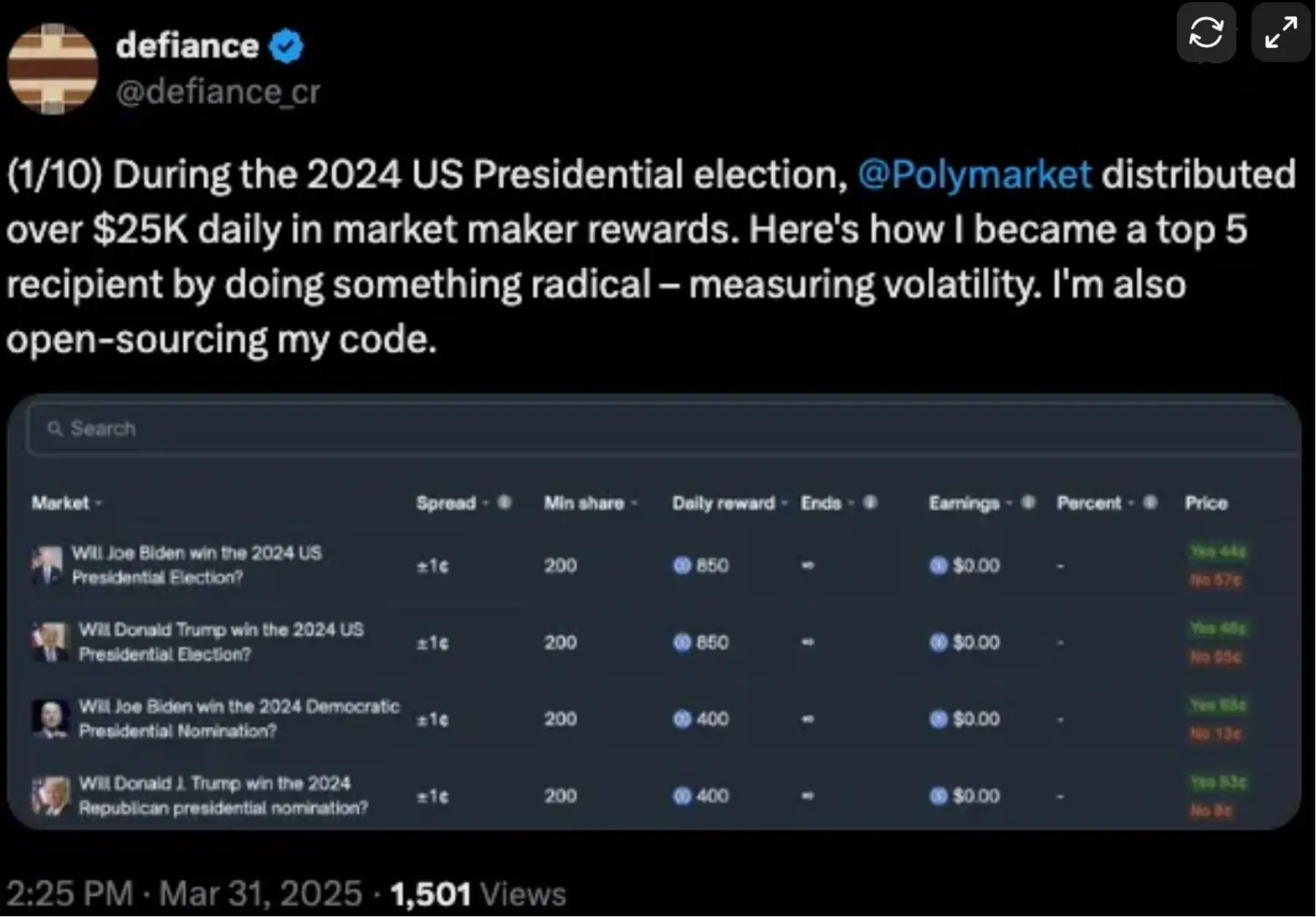 一位名叫@defiance_cr的交易者接受了Polymarket官方的采访,详细分享了他如何构建自动化做市系统。在巅峰时期,这套系统每天产生700-800美元的利润。