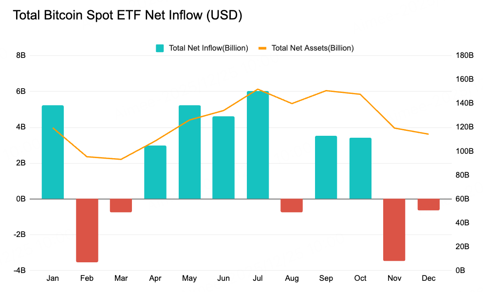 总体而言,2025年BTC现货ETF的流通变化主要受美国宏观周期和市场波动驱动:降息预期决定中期方向,关税与财政风险放大波动,而极端事件加速去风险,表明比特币虽已进入机构配置体系,但仍处于由高波动资产向稳定宏观配置资产过渡的阶段。