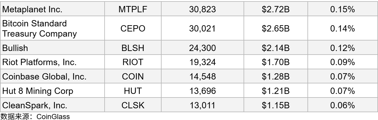 2025年BTC DATs储备数据显示,上市公司在比特币配置上呈现明显分层。Strategy以约671,268枚BTC位居首位,占流通量约3.20%,尽管市场深度回调,其仍持续增持以巩固市场定位。但其股票相对比特币持仓的估值显著压缩,mNAV降至约1.08倍,处于近年低位,反映市场对其“比特币代理股”属性的信心下降。总体来看,头部BTC DATs公司具备战略优势,但也面临高估值波动风险。单一依赖BTC储备的模式具备高beta特征,在上涨周期放大收益,在震荡或下行阶段则放大亏损与估值折价压力。相比之下,业务多元化的公司(如Coinbase)表现出更强的风险缓冲能力。