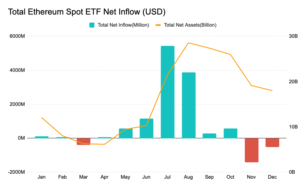 2025年ETH现货ETF资金流动呈现出明显的阶段性与高波动特征。年初资金小幅流入后,3月在市场不确定性上升背景下出现明显流出,反映出早期资金的谨慎态度。进入二季度后5月和6月资金流入显著增加,尤其6月净流入约11.6亿美元,纽约ETF总净资产重回100亿美元以上,表明机构与长期资金在价格稳定或反弹阶段重新加码。7月和8月更是出现爆发式净流入,分别达到约54.3亿美元与38.7亿美元,带动ETH ETF总净资产攀升至全年高位约285.8亿美元,显示在ETH价格回升后机构配置需求显著提升。但随后受到10.11的影响ETF出现大幅流出,尤其在11月出现约14.2亿美元的净流出拉低总净资产至约191.5亿美元。
