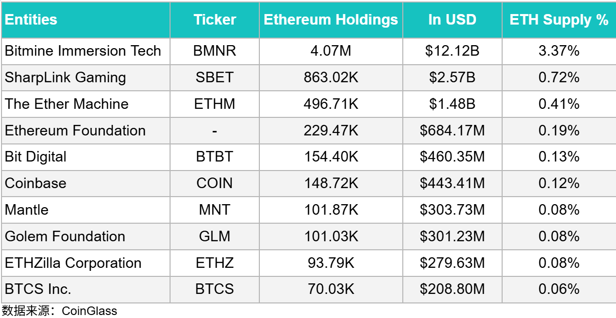 2025年ETH价格的大幅上涨与BitMine和SharpLink等企业大规模累积以太坊储备的节奏密切相关。这些公司采取了类似于之前Strategy对BTC的资产负债表累积策略,通过定向增发、私募等融资方式持续买入ETH。其中,BitMine不断扩大其ETH储备量约407万枚,占ETH总供应量约3.37%,其持仓价值高达121.2亿美元,远超其他公司。紧随其后的是SharpLink Gaming与The Ether Machine,分别持有约86.30万和49.67万枚ETH,用于支持其流动性布局与生态参与;Coinbase的ETH库存在很大程度上服务于交易所运营与网络服务需求,而非纯粹的资产增值策略。整体来看,上市公司ETH持仓既有积极押注以太坊生态成长的战略性玩家,也有基于运营性需求或多元资产配置的参与者,这种差异化布局表明ETH正被越来越多纳入企业资产负债管理框架中,不再仅是交易或投机标的,而是具有战略价值与生态协同作用的核心数字资产。