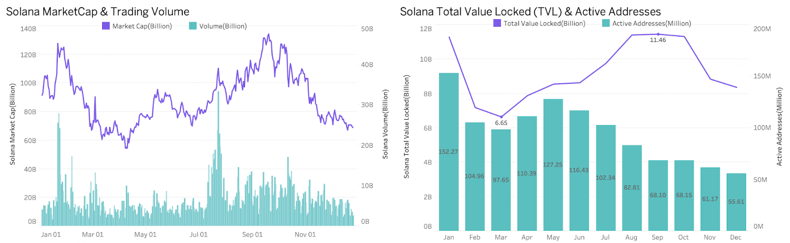 2025 年年初,SOL 在高市值和高活跃度基础上进入回调,市值快速下滑,交易量收缩,TVL 与活跃地址数大幅下降,显示 Ai Agent Meme 热度退潮后链上资金和用户留存不足。二季度至三季度中段,SOL 迎来修复行情,市值和价格反弹,7–9 月达到全年高位,交易量明显放大,TVL 回升至峰值,显示资金重新流入 DeFi 与链上应用。但活跃地址数持续走低,主要因 Meme 热度被 BNB Chain 分流。四季度,SOL 进入下行与去杠杆阶段,市值、交易量和 TVL 回落,活跃地址数降至全年低点,链上参与度减弱。