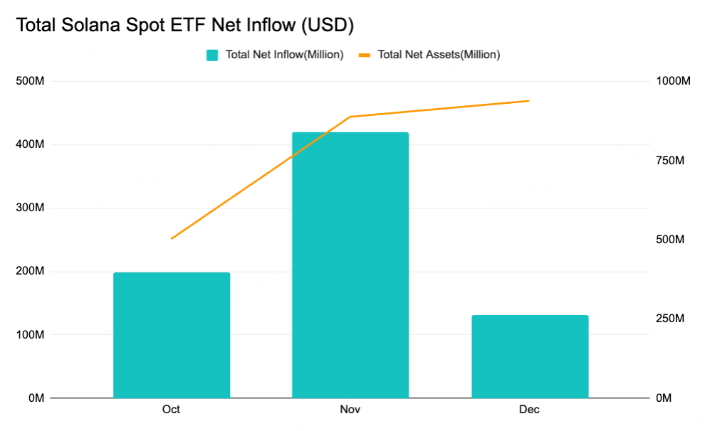 Solana现货ETF首批产品于10月28日正式上市,截至12月,其管理资产规模已达到约9.2亿美元。由于上线时间较短,Solana ETF在2025年内尚未形成足够规模的持续买盘,因此对SOL当年的价格表现提振作用相对有限。不过,从资金流向结构来看,Solana ETF仍具备一定的积极信号:尽管SOL价格在上市后阶段性走弱,ETF资金却呈现出“越跌越买”的逆势净流入态势。这表明部分中长期资金正在低位逐步布局Solana,为其后续价格修复和生态估值重塑埋下潜在伏笔。