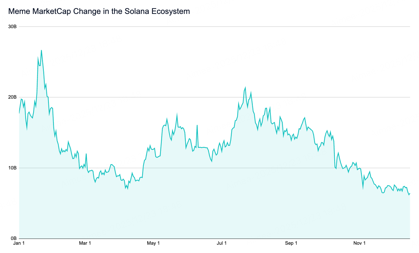 2025年Solana生态的Meme赛道在经历了年初爆发式增长后逐步降温,造成这一现象的主要原因是竞争格局变化、内部生态动力不足及缺乏新的Meme叙事周期等多重因素造成。首先,年初AI Agent为Solana Meme赛道带来大量的了关注度与市值增长,但是随着加密市场的整体回调相关的Meme资产市值迅速下跌,导致Solana Meme市值从高点回调超过50%。此后年中时Solana生态曾因 Pumpfun发币以及Bonkfun的崛起重获一轮热度,带动链上Meme交易量与参与度短暂回升,但这波热潮缺乏延续性。