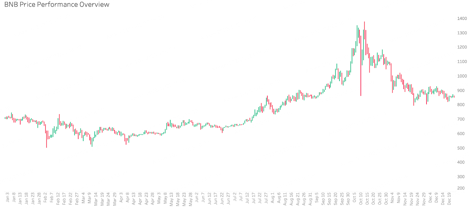 2025年对BNB而言是表现强劲的一年。其价格自4月探底约509美元后一路走高,并于10月13日突破历史前高,触及1370美元,阶段涨幅超过169%。本轮上涨主要得益于币安生态的持续建设与市场运营的有效推动:币安Alpha上线吸引了大量用户参与,同时创始人CZ与联合创始人何一凭借其行业影响力,在推特中积极营造话题,成功带动了BNB Chain上Meme板块的活跃——例如“中文Meme”、“币安主题Meme”等热点层出不穷,显著提升了该链的市场关注度与资金参与意愿。