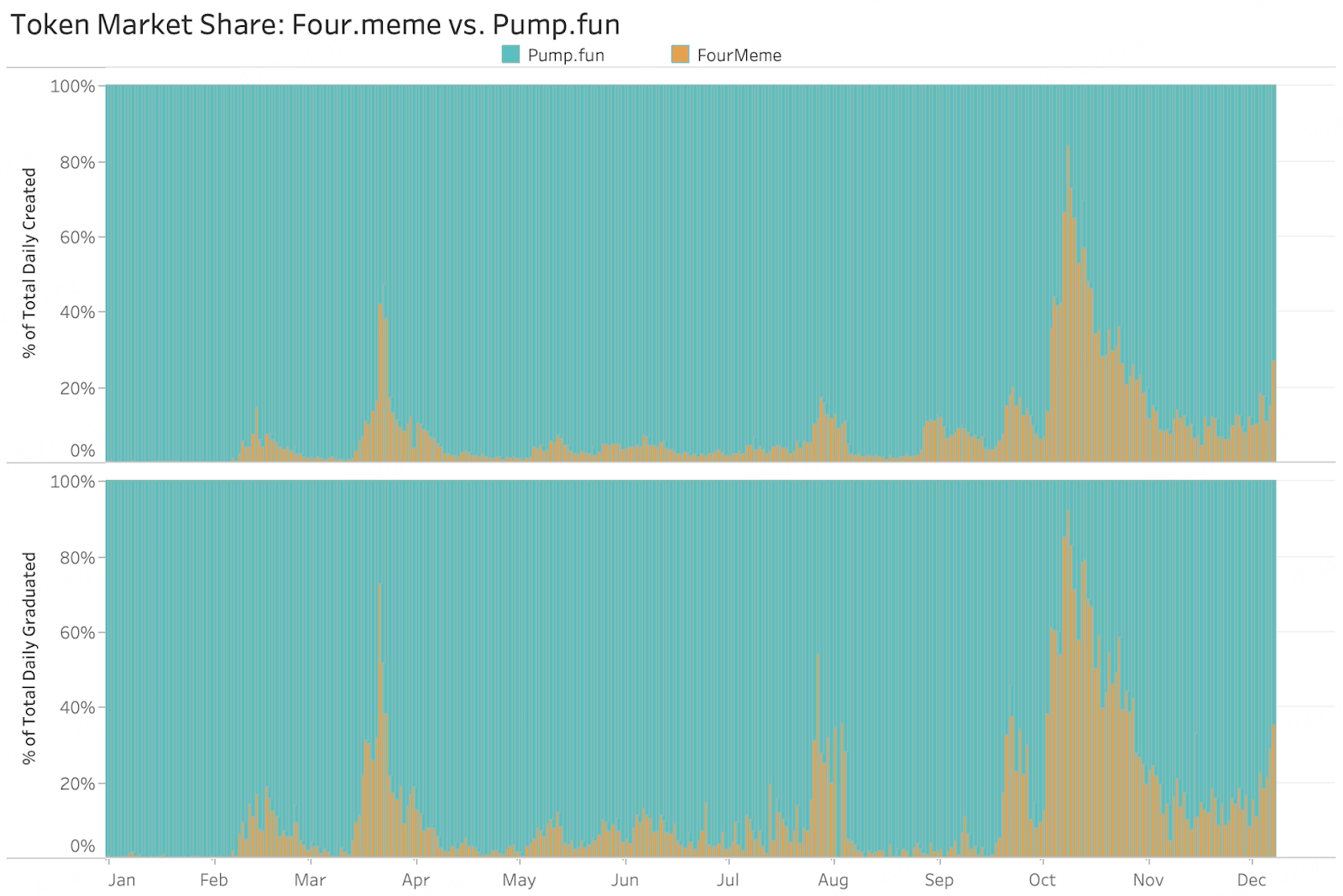 年初,Solana链上的Pump.fun占据主导,但自第二季度起,BNB Chain生态内的FourMeme平台份额持续攀升并于下半年实现了反超并确立领先。这一变化直接对应了Solana与BNB Chain两条公链在2025年的命运交错:Solana在Ai Agent Meme热度退潮后,链上真实资金与用户留存不足的问题暴露,活跃地址数持续走低,资金与注意力被BNB Chain抢占;而BNB Chain则通过各类币安题材的Meme成功吸引了大规模新用户与交易量,实现了链上活跃度的历史性跨越。