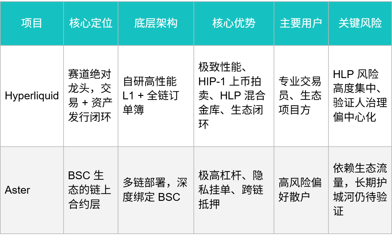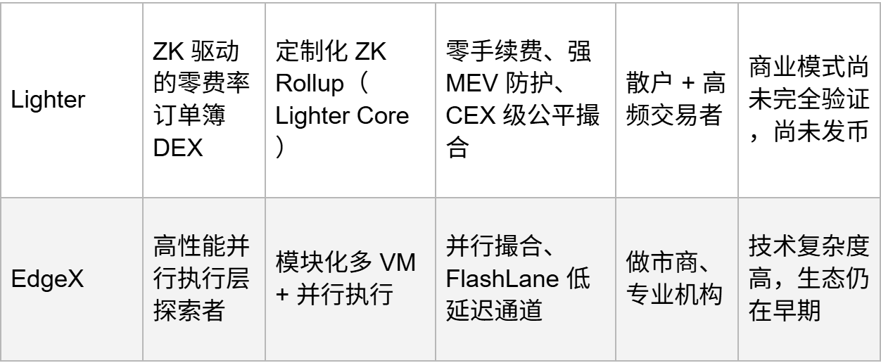 Hyperliquid凭借自研高性能L1、全链订单簿、资产发行闭环与HLP机制,仍是赛道综合实力最强项目,适合追求深度与效率的专业用户,但其结构集中带来系统性风险。Aster依赖BSC生态红利,短中期爆发力强,但长期独立竞争力有限。Lighter代表技术天花板型路线,公平性和抗MEV能力突出,但商业模式仍在验证中。EdgeX偏向底层基础设施优化,为高频与专业交易提供性能潜力,但市场接受度与生态建设仍需时间。