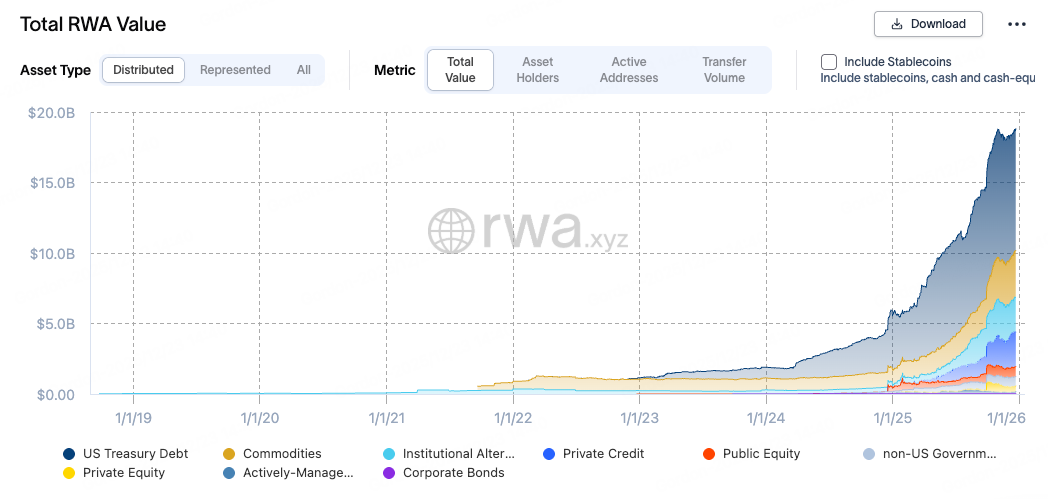 2025年,现实世界资产(RWA)赛道完成了从叙事到规模化落地的关键一跃,成为Web3领域确定性最高的增长引擎。数据显示,其市场总价值实现了跨越式增长,标志着行业已彻底脱离概念验证阶段,进入由机构化资本和清晰监管共同驱动的爆发期。这一爆发本质上源于RWA独特的定位:在全球增长叙事中,它成为传统资本(Old Money)与加密资本(New Money)罕见的价值共识交汇点,两者在明确的监管试点和收益需求下形成合力,推动了市场的快速扩张。