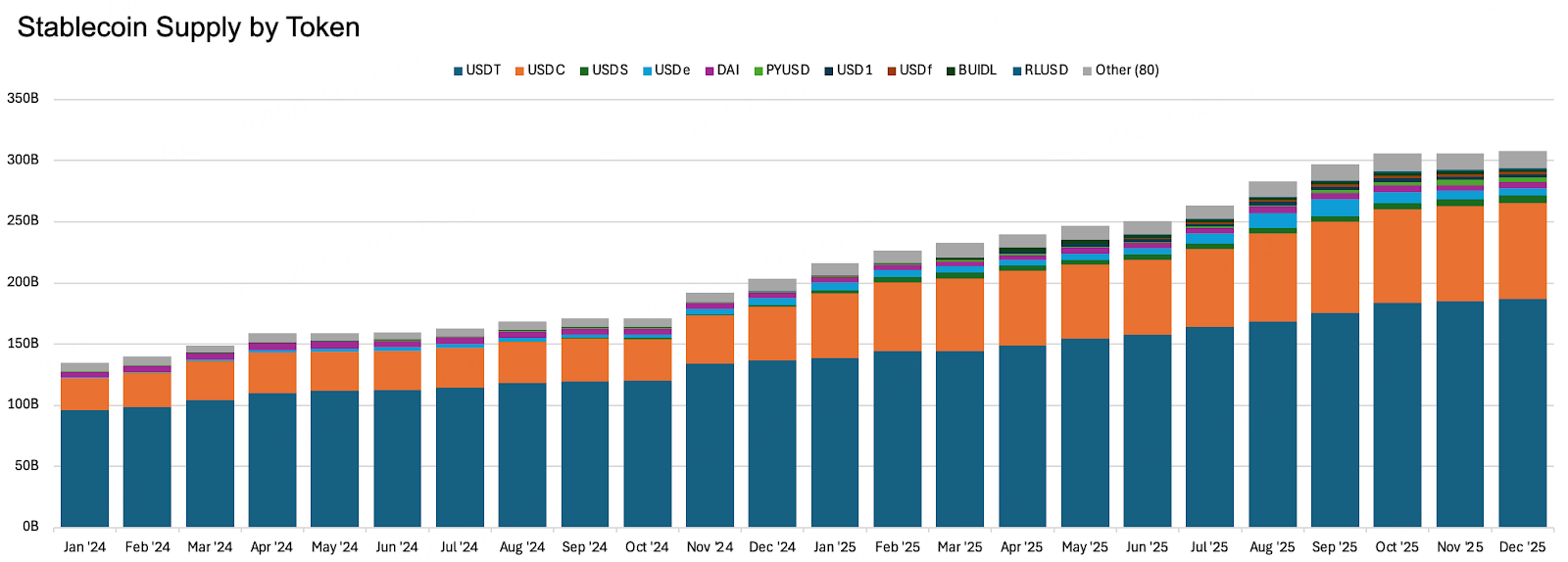 2025年是稳定币赛道的历史性分水岭。随着美国《GENIUS法案》与欧盟MiCA等关键监管框架落地,稳定币彻底告别“灰色金融工具”身份,进入高度合规化与制度化的竞争新纪元。其角色也发生根本性演变:从加密市场内部的交易媒介,升级为整个链上金融体系的基础货币层。在这一背景下,稳定币市场在2025年呈现出总量跃升与结构重塑的双重特征。从总量看,流通量较2024年实现显著增长。这固然得益于全球货币政策的转向宽松,但最直接的驱动力是监管破冰。明确的法律框架消除了传统金融机构的合规疑虑,吸引了大规模机构资金入场。