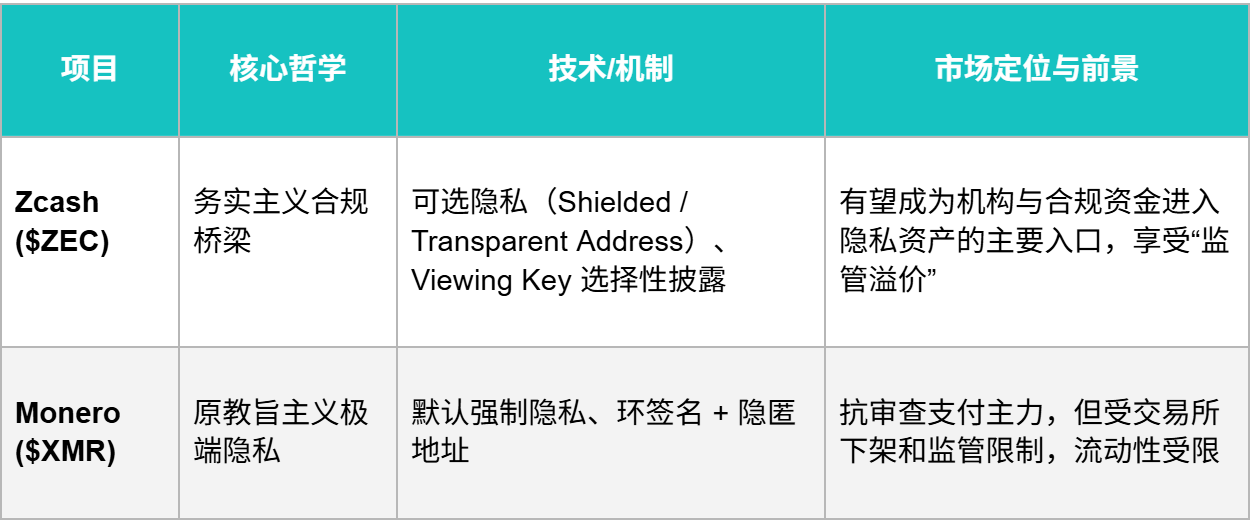 2025 年,隐私赛道内部出现了清晰的路线分化,以Zcash与Monero为代表的两大隐私币走向完全不同的生态位。Zcash 的优势在于“可被监管理解”,以牺牲部分纯粹性换取制度内生存空间;Monero 的优势在于“不可审查”,但合规市场几乎关闭,流动性高度受限。隐私币的竞争,已从技术之争演变为生存策略之争。