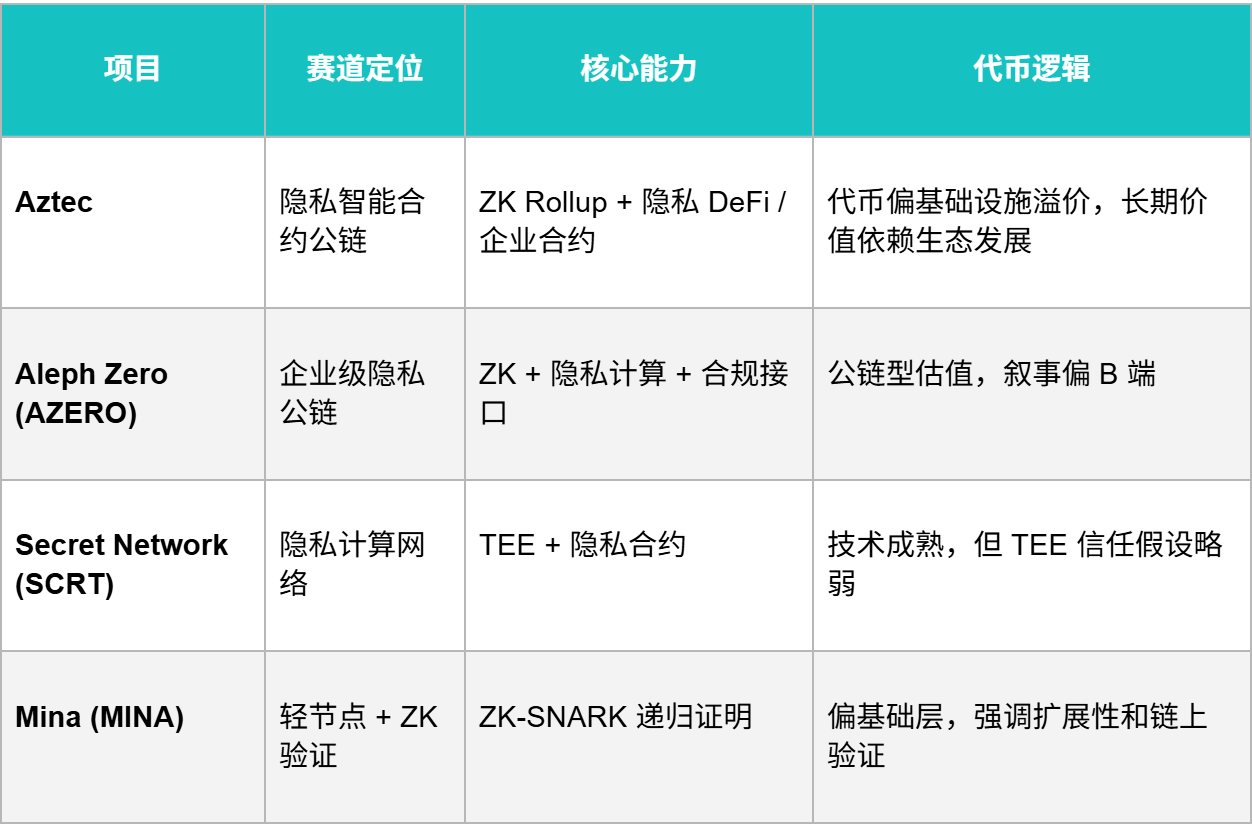 如果说隐私币主要解决“个人转账隐私”,2025 年真正打开长期天花板的是零知识证明(ZK)驱动的隐私基础设施赛道。这一分支不强调完全匿名,而强调“可验证但不可见”,更适合机构、RWA 与企业级金融场景。ZK 隐私路线的核心优势在于不与监管正面冲突,可服务 RWA、企业结算和隐私 DeFi,更容易被 TradFi、机构与政府系统接纳。但其劣势在于技术复杂度高、开发成本大,用户体验仍弱于传统链,代币价值捕获路径尚在早期。