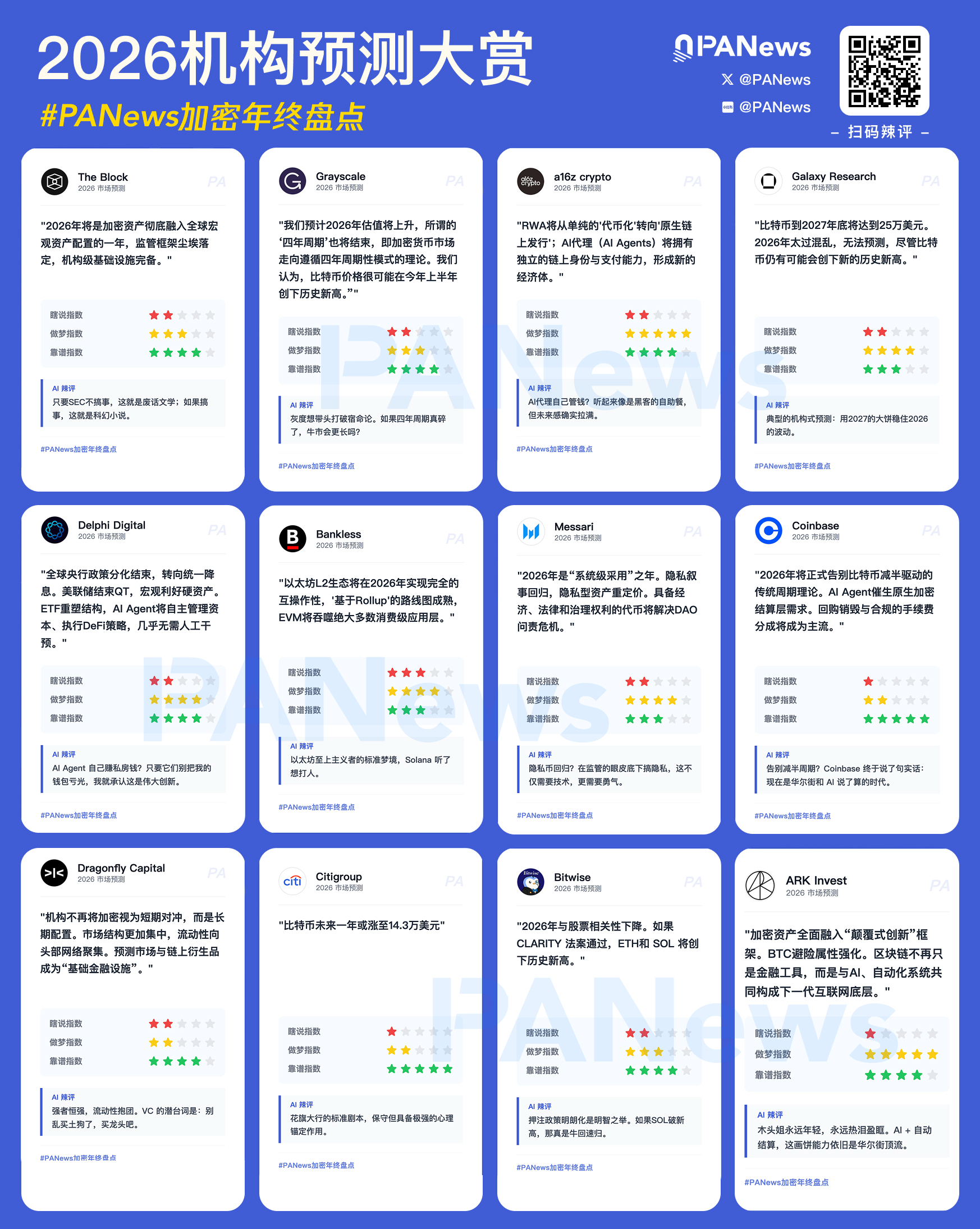 你也可以把自己的 2026 预测丢进去测一测,对照图里 Grayscale、a16z、Messari、Coinbase、ARK 等机构的评分,看看到底是谁更敢说、谁更靠谱。