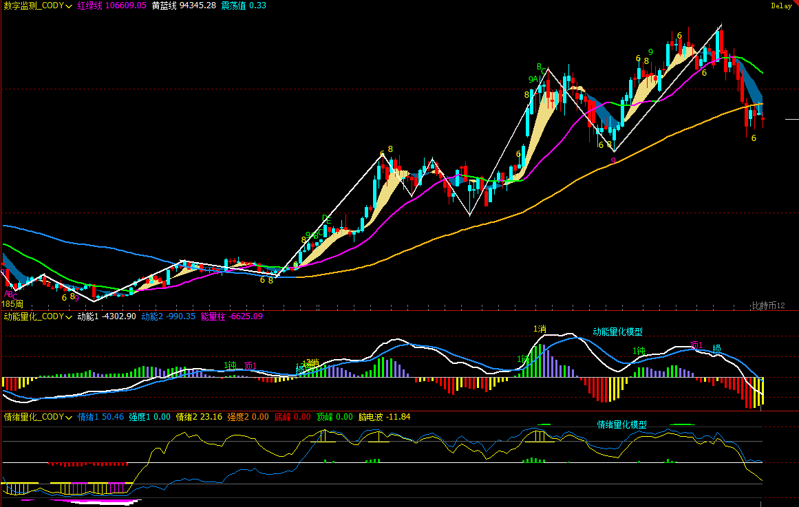 比特币周 K 线图:(动能量化模型+情绪量化模型)