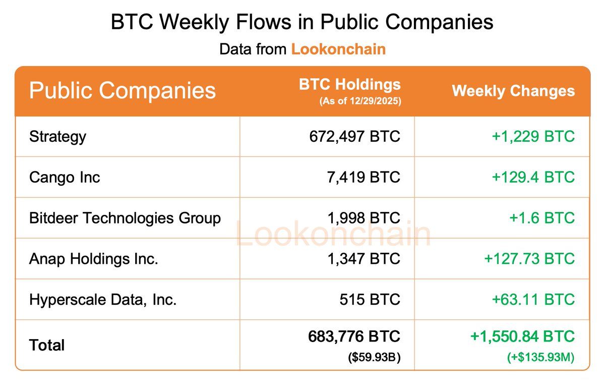 🟢 上周,5家公司增加了1,550.84 BTC(1.3593亿美元)的持有量。