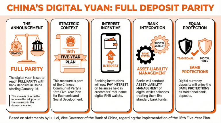数字人民币即将与中国的银行存款达到平价,此举旨在增加该货币在国内市场的采用。