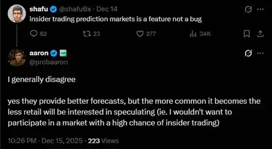 Kalshinomics 创始人 @probaaron 就对 @shafu0x 的观点进行了反驳,「我通常不同意这种说法。没错,它们确实能提供更准确的预测,但随着它们越来越普遍,散户对投机的兴趣就会降低(例如,我不想参与一个内幕交易可能性很高的市场)。」