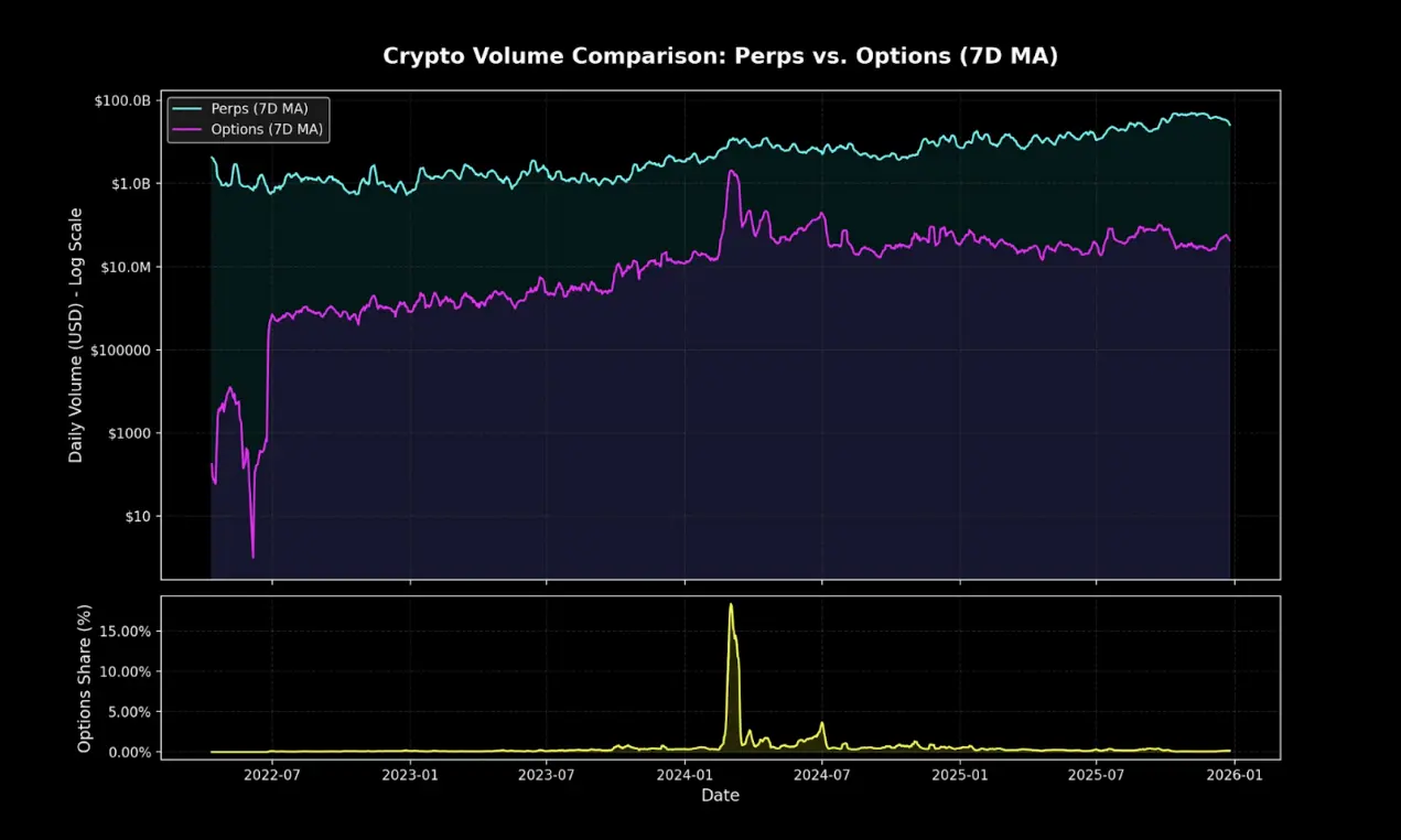 讽刺的是,理论上更安全、更贴合用户意图的期权却不如风险更高、机制更复杂的永续合约普及。