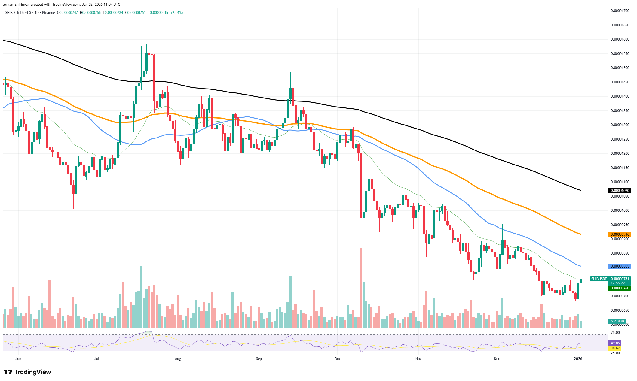 截至目前,SHIB的价格走势仍然缓慢。26日和50日的指数移动平均线(EMA)在图表上作为上方阻力,显示该资产被困在重要的移动平均线之下。价格仍然接近局部低点,波动性仍然较低。这一点至关重要:流出并不会立即导致价格上涨。