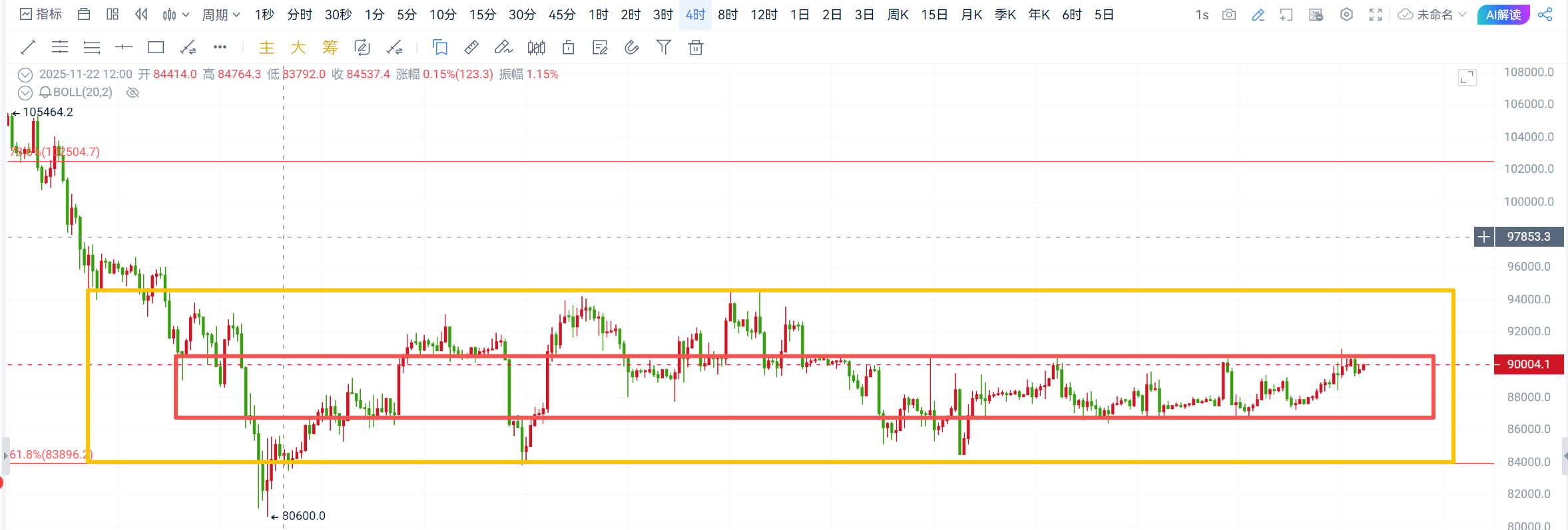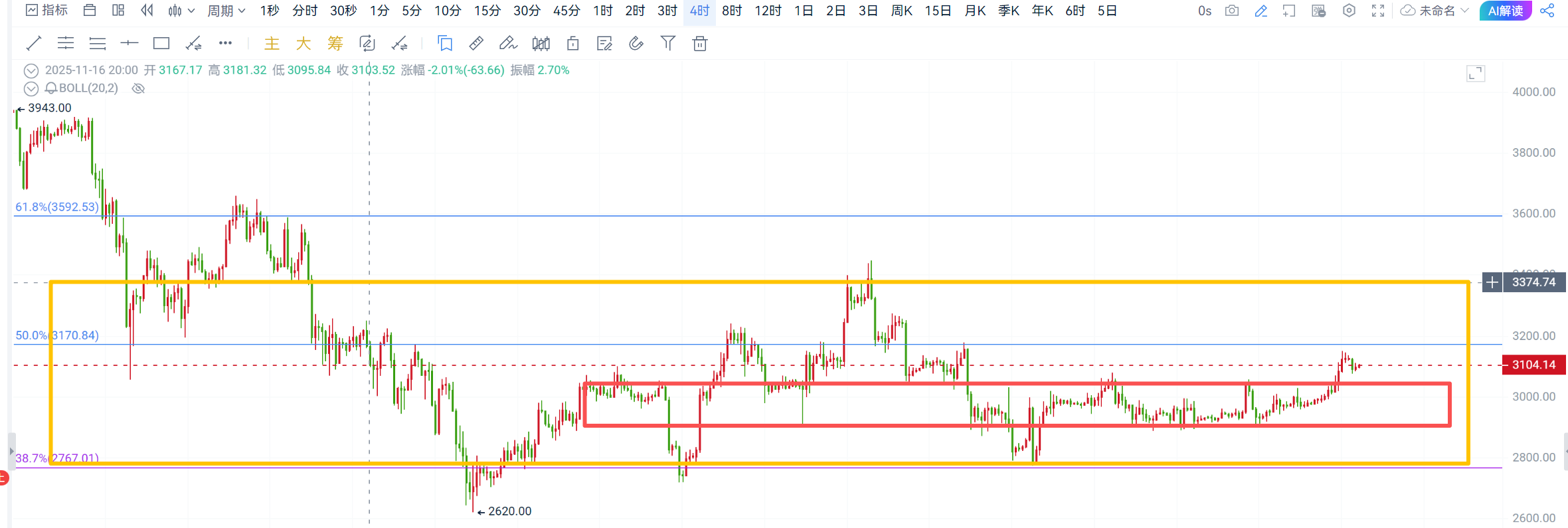 4小时级别,大饼从形态上看已有上行迹象,破位窄幅震荡整理压制位90000可看至94500一线,以太是已经上破窄幅震荡压制位3030一线,目前可看至3230-3400一线!