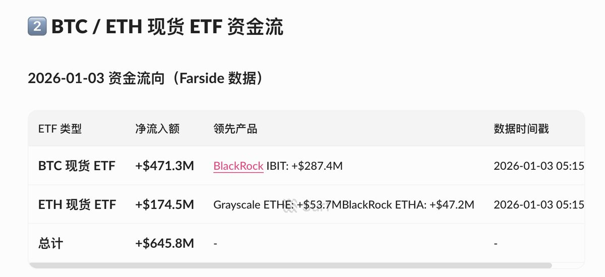 BTC ETF净流入471M USD(BlackRock主导287M);ETH ETF净流入174M USD(Grayscale54M)。
