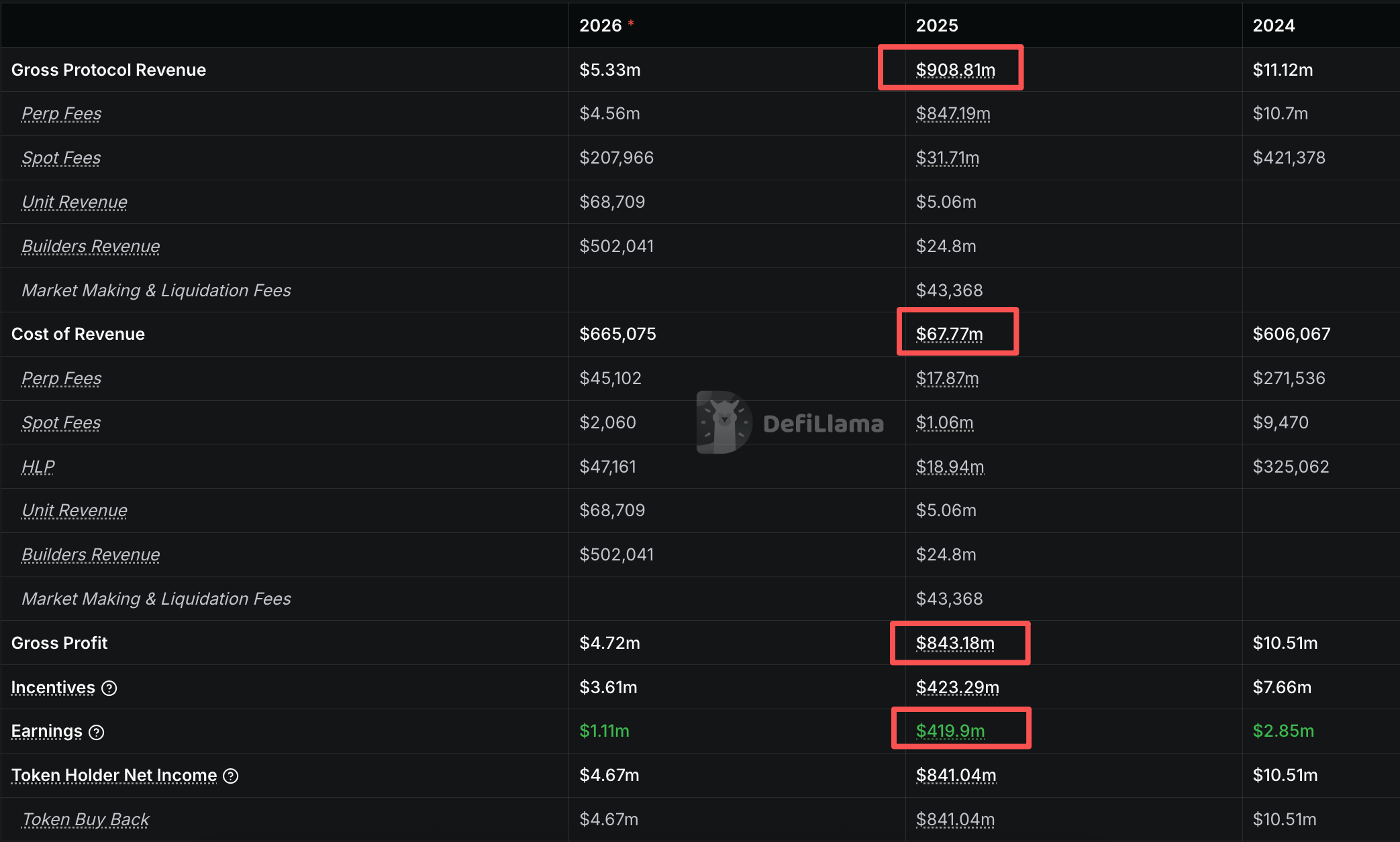 据 DefiLlama 数据,Hyperliquid 2025 年收入为 9.08 亿美元;营收成本约为 6777 万美元,年度净利润约为 8.43 亿美元,剔除激励型支出,2025 年收归平台的净利润高达约 4.2 亿美元。