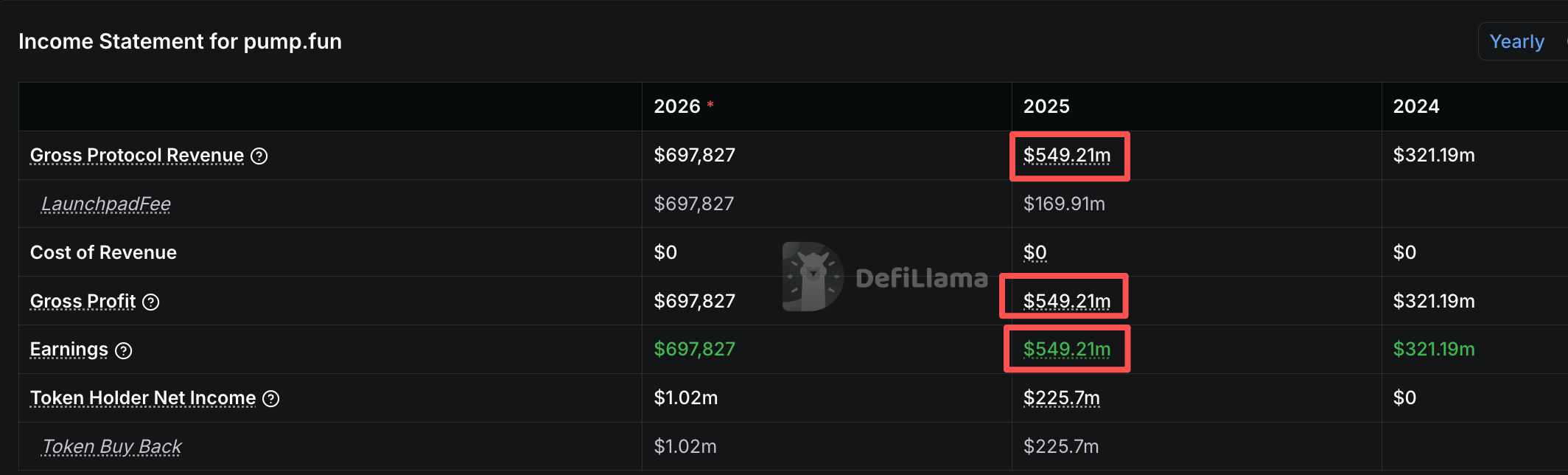 据 DefiLlama 数据,Pump.fun 2025 年度收入约为 5.5 亿美元,和 Hyperliquid 等链上 perp DEX 平台不同的是,作为一个“一键发币平台”,Pump.fun 无需支出激励费用,因而其平台年度净利润约等于年度收入,即 5.49 亿美元。
