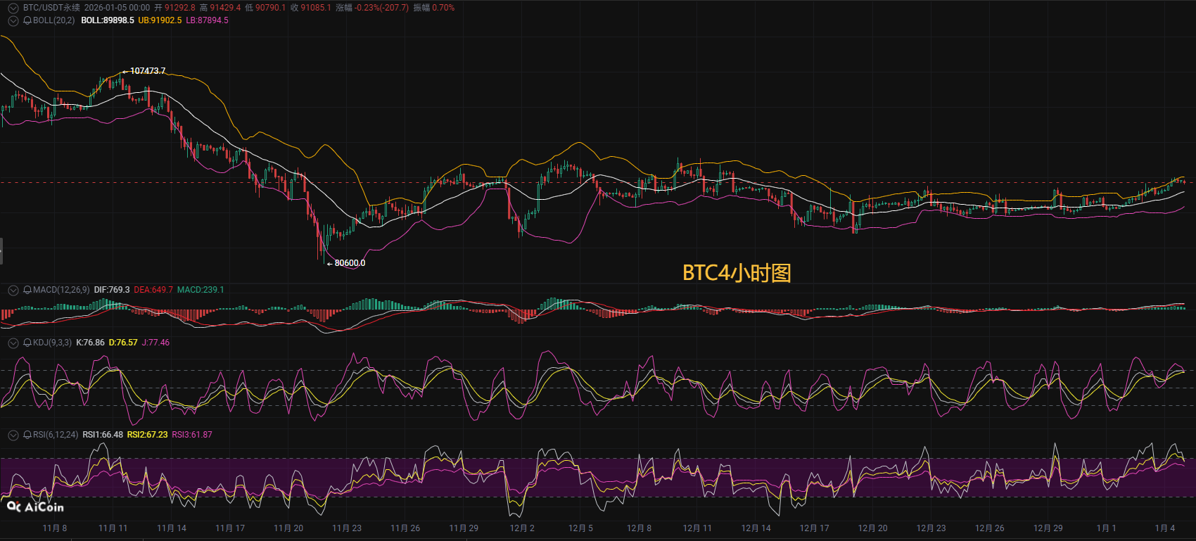 比特币日内延续反弹,多头情绪小幅回暖,价格临近91800一线,截止发稿价格更是企稳在9万上方运行,目前币价在91000附近运行,后续若是持续企稳,预计日内涨幅还将延续。4小时级别在触及91800附近高点后出现长上影线,但上方抛压较重,短期可能出现回调;日线虽连续3日收阳,但实体逐渐缩小,随后多头动能减弱,
