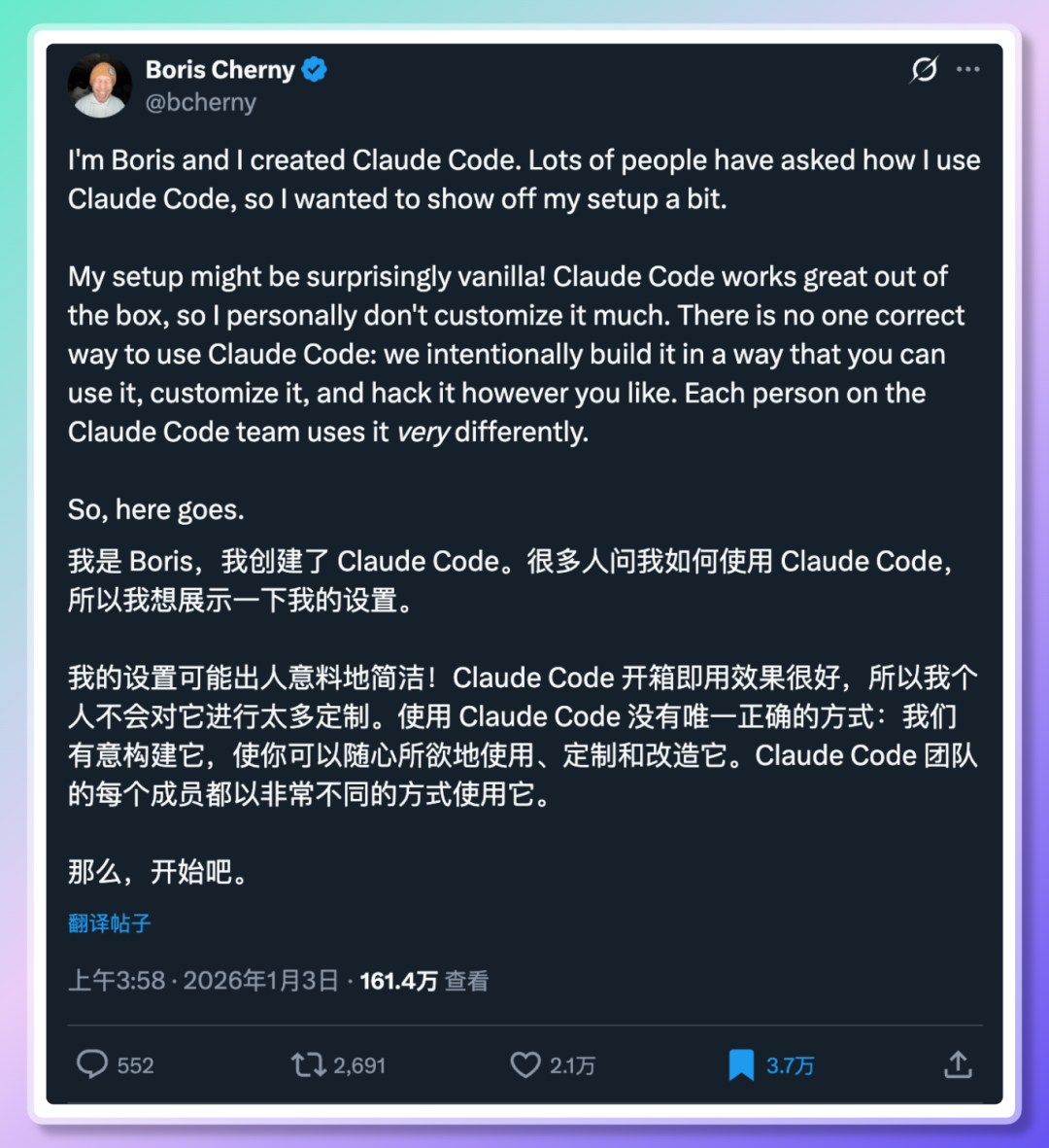 Boris Cherny 作为 Claude Code 之父,他写了一篇非常详细的推文,分享了自己如何高效使用这款工具,以及他和团队在实际工作中如何将 Claude 深度集成进整个工程流程。