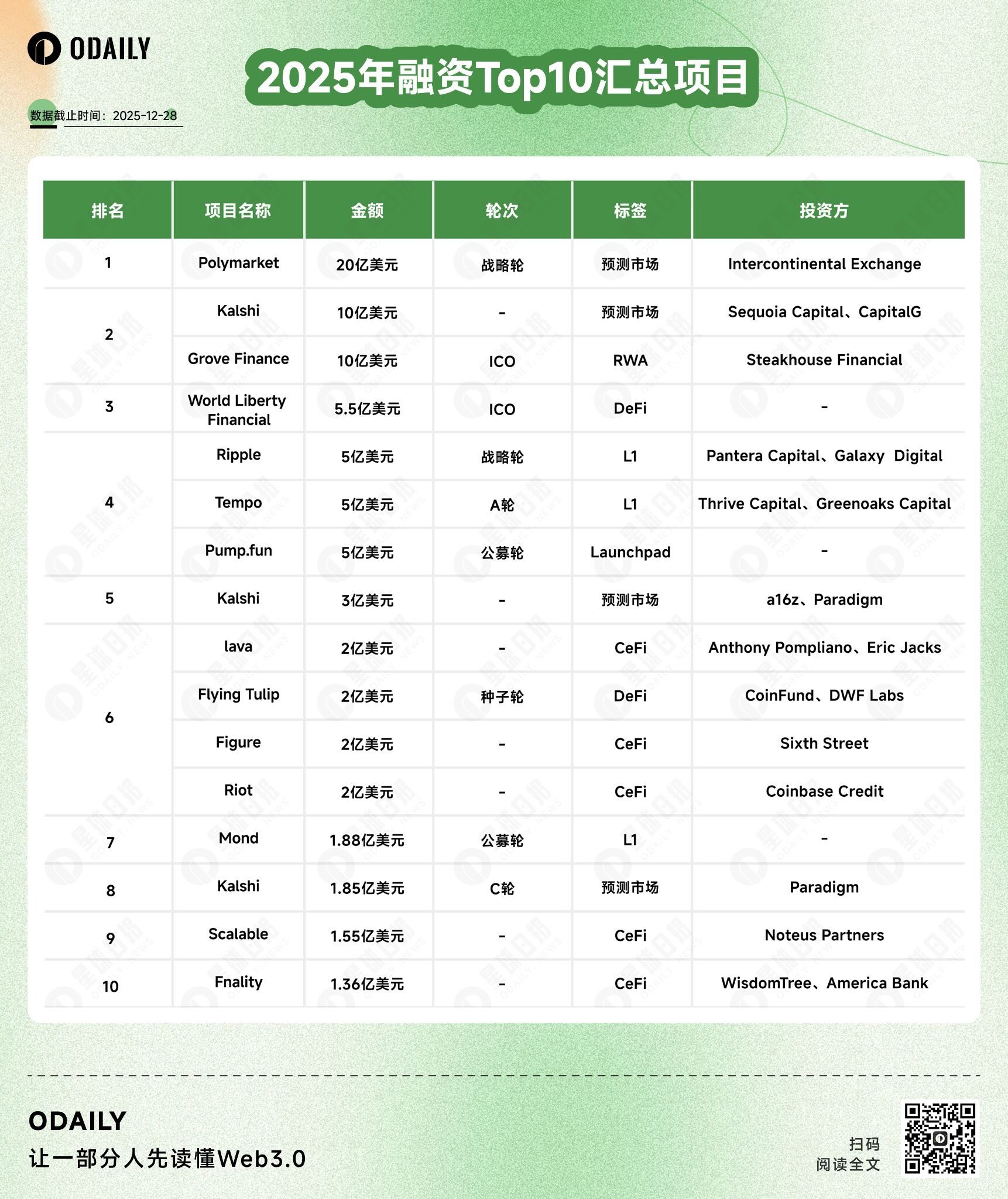 从 2025 年融资金额 Top 10 的榜单中可以看出,Polymarket 与 Kalshi,几乎构成了 2025 年融资的全部叙事。
