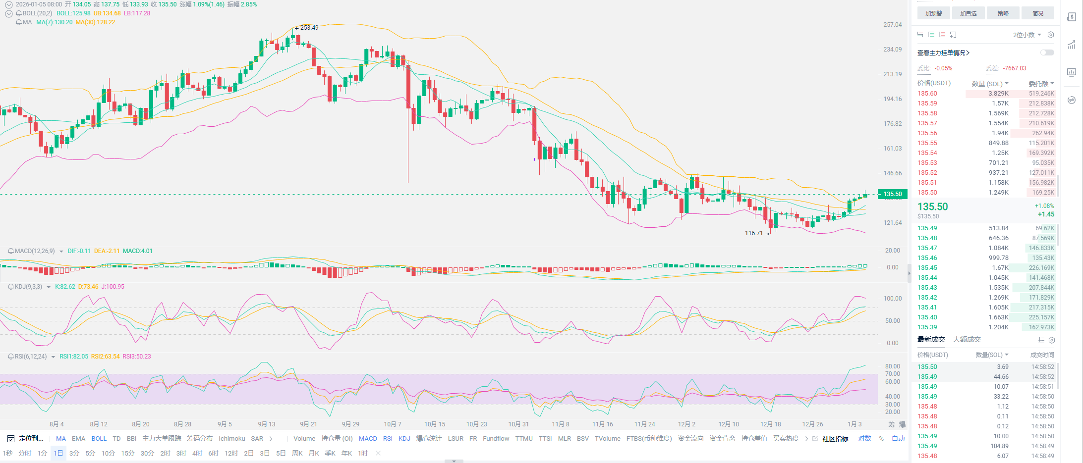 老崔总结:今日就简单叙事,多头的形态并未发生改变,但做合约的各位,如果没有抓住前期的机遇,现阶段最好等一波大跌再行进场;已经进场的用户,尤其是多头,等即可。如若是空头,那么空军恐怕会需要一定的时间。观察小币种的走势,SOL的爆发,至少会延续半年,前期有进行抄底的用户,老崔相信各位也都是一直在补,现阶段我们也看到了回头。这种反弹还是不够,短期当中是有空的可能。无论是多头还是空头,都必须等待一根强针出现才能判断趋势。只要仓位不大,产生了亏损的用户,可以拿一拿。以年为单位的持有用户, 任何时间段都可以进场,这波牛市的主升浪还并未来临。大家记住,USDT与USDC都还在超发,一旦迎来牛市,都会出现新高。川普下任之前的半年到一年期内,暂避风口即可!不懂就问!