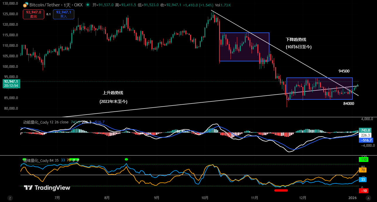 Odaily 特邀行情分析师 Cody Feng,美国哥伦比亚大学金融统计硕士,自大学期间专注美股量化交易,并逐步拓展至比特币等数字资产,在实战中构建出一套系统化的量化交易模型与风险控制体系;对市场波动具备敏锐的数据洞察力,并立志于在专业交易领域持续深耕,追求稳健回报;将于每周深挖 BTC 技术、宏观、资金面等变化,复盘并展示实操策略,预告近期值得关注的大事记,以供参考。