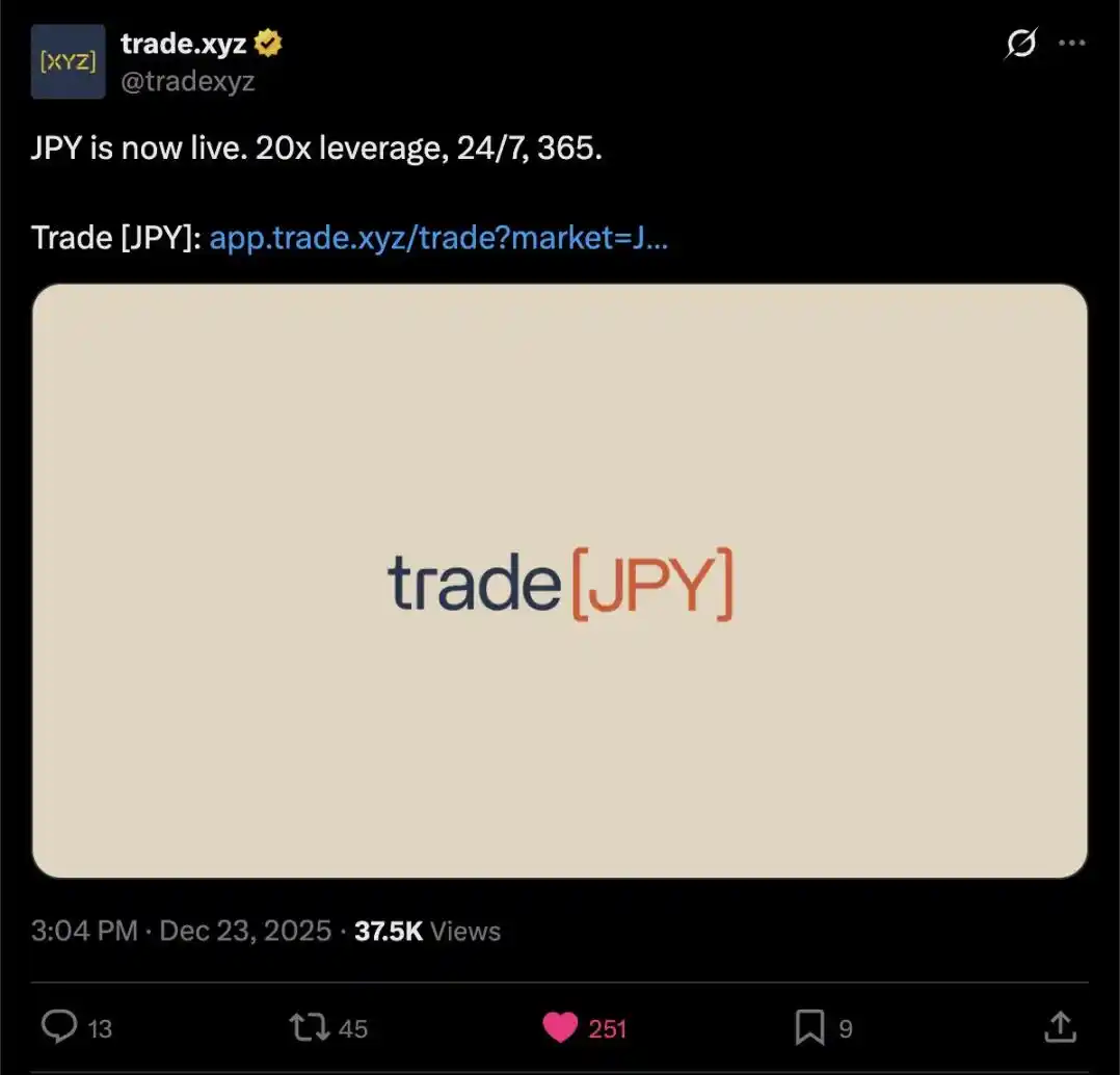 消息很快传到了 trade.xyz 的耳朵里。这家公司反应神速,立刻抢占了日元兑美元(JPYUSD)的交易对,宣布要率先在 Hyperliquid 上推出外汇交易产品。