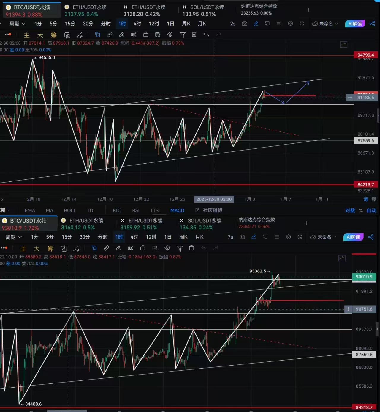 由于思路更新时行情已经走了一段,我们92800进场的空单暂持有,93500一带的现价可以进场,94200补仓,止损94666. 若做反弹接力可以在91800一带进,90800补,90250损