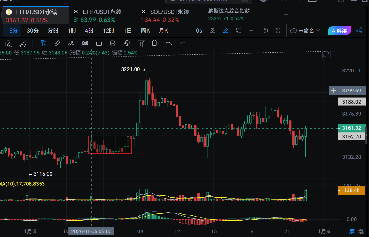 以太不变则围绕3120和3180做波段,做多的补仓在3085,空单的补仓在3215。止损则3065和3235。止盈区间围绕对向的进场区间,日内震荡偏空,这样走盈亏比高。