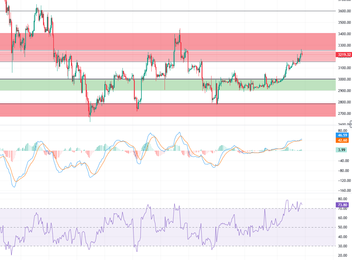 以太坊同步跟随反弹,凌晨最高触及 3265 附近后承压回落。日线级别同样以连阳姿态切入前期高点区域,不过 RSI 指标走平并处于超买区间,多头动能有衰减迹象。四小时级别均线多头排列后出现背离结构,K 线收出倒锤线,承压信号明显;小时级别修复需求突出,后续上涨需量能进一步加持。日内支撑关注 3150-3110 区域,上方阻力则看向 3250-3300 区间。
