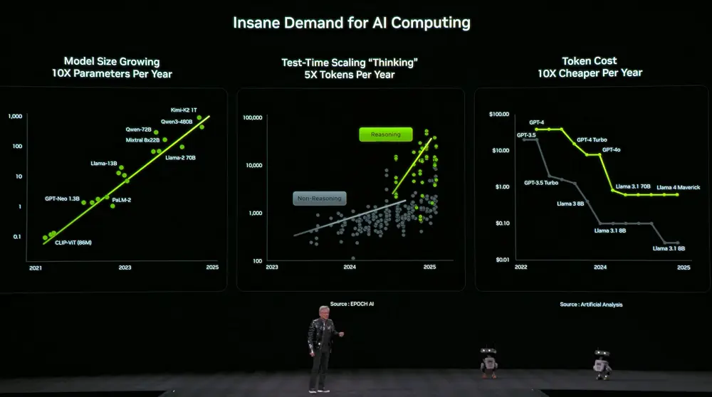 与此同时,对算力的需求也急剧飙升。模型的尺寸每年增长10倍,模型用于思考的token数量每年增长5倍,而每个token的价格每年降低10倍。