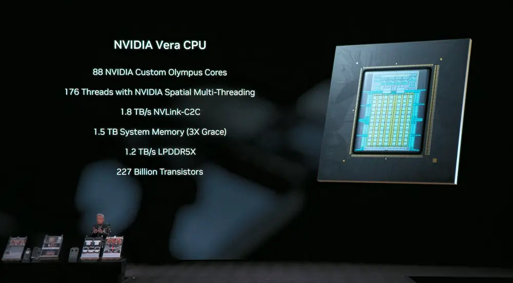 Vera CPU:为数据移动和智能体处理而设计,拥有88个英伟达定制Olympus核心、176线程的英伟达空间多线程,1.8TB/sNVLink-C2C支持CPU:GPU统一内存,系统内存达1.5TB(是Grace CPU的3倍),SOCAMM LPDDR5X内存带宽为1.2TB/s,并支持机架级机密计算,数据处理性能翻倍提升。