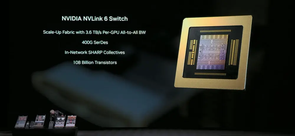 NVLink 6 Switch:单lane速率提升至400Gbps,采用SerDes技术实现高速信号传输;每颗GPU可实现3.6TB/s的全互连通信带宽,是上一代的2倍,总带宽为28.8TB/s,FP8精度下in-network计算性能达到14.4TFLOPS,支持100%液冷。