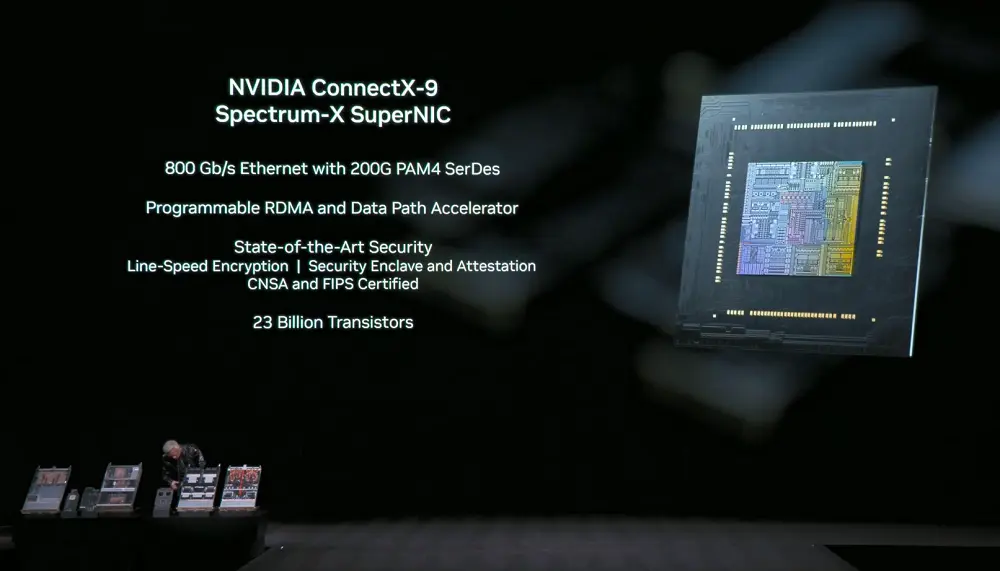 NVIDIA ConnectX-9 SuperNIC:每颗GPU提供1.6Tb/s带宽,针对大规模AI进行了优化,具备完全软件定义、可编程、加速的数据路径。