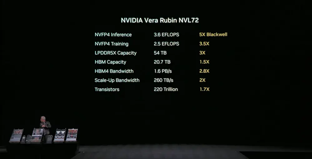 该系统LPDDR5X内存容量达54TB,是上一代的2.5倍;总HBM4内存达20.7TB,是上一代的1.5倍;HBM4带宽是1.6PB/s,是上一代的2.8倍;总纵向扩展带宽达到260TB/s,超过全球互联网的总带宽规模。