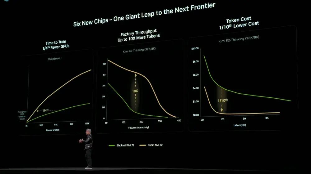 由于在6款芯片、托盘、机架、Pod、数据中心与软件层面实现了极致协同设计,Rubin平台在训练与推理成本上实现了大幅下降。与上一代Blackwell相比,训练相同规模的MoE模型,仅需1/4的GPU数量;在相同延迟下,大型MoE模型的token成本降低至1/10。