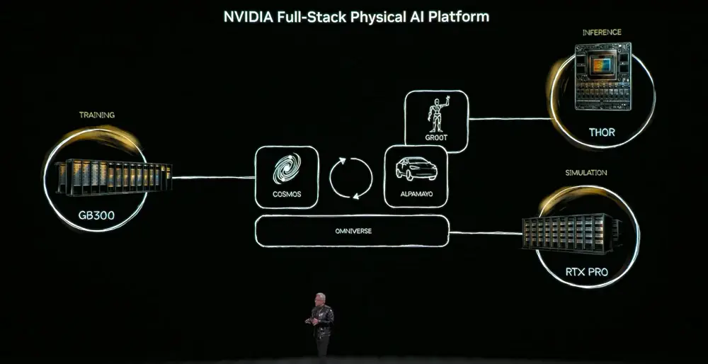 而其中的核心模型是Cosmos世界基础模型,将语言、图像、3D与物理规律对齐,支撑从仿真生成训练数据的全链路。