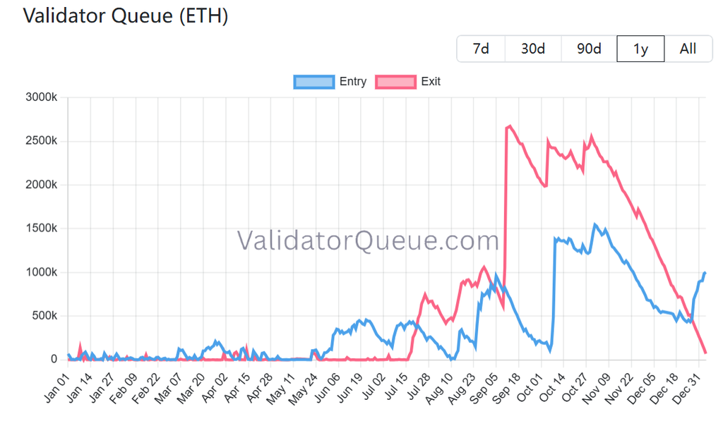 具体来看,2025年9月中旬ETH价格冲高至4700美元附近时,累计266万枚ETH选择退出质押,形成了持续数月的卖压。经过三个半月的消化,目前等待退出的ETH仅剩约8万枚,这意味着卖压来源基本消除。与此同时,等待进入质押的ETH却激增至90-100万枚,较12月底的41万枚增长约120%。这个数字是退出队列的15倍,导致验证者激活等待时间延长至17天。