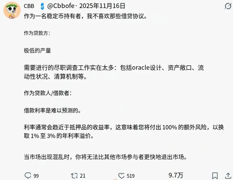 首先,大多数链上资金只信任 Aave、Morpho 等头部协议的安全性,并习惯了被动理财。