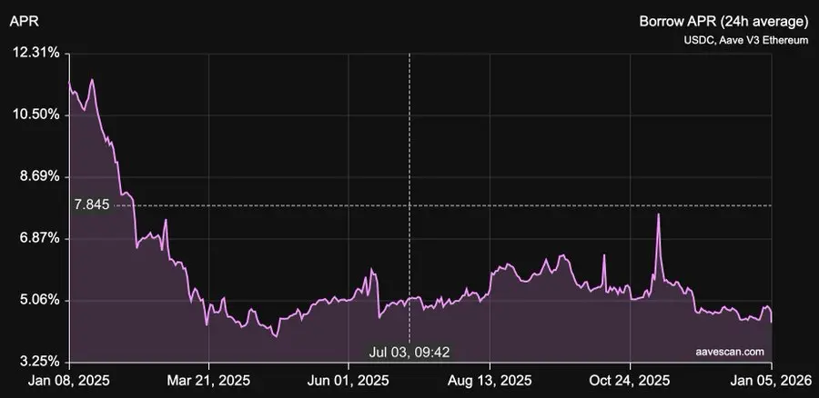 (Aave ~3.5% vs Maple ~8%:固定利率、加密抵押贷款有 ~180–400 个基点的溢价)