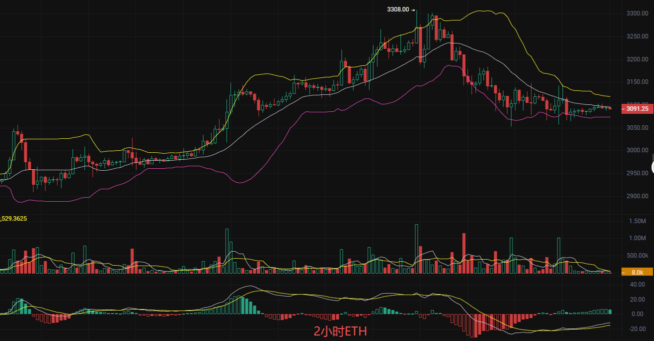发稿前以太坊现价3091,丽盈判断目前盘口处于盘整阶段在3100附近震荡,未能突破前高3145一线,呈现弱势整理。日线连续多日收小阴小阳线,波动幅度减小,显示市场观望情绪浓厚。MACD2小时逐步缩窄,短期有金叉迹象,表明箜投力量衰减。主力EMA在EMA7横盘在3095,受制于EMA30阻力3115,EMA120压制整体趋势,所以丽盈给出的思路是盘整行情,非专业人事多看少动,减少容错率