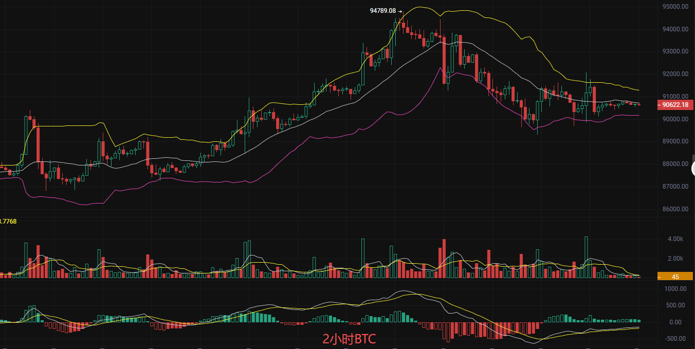 比特币现价90600,丽盈判断目前盘口处于盘整阶段,日线在持续下跌,形成连续阴线,但下影线较长,表明低位有一定支撑。2小时K线呈现震荡整理状态,波动幅度逐渐收窄。技术指标MACD日线和2小时箜投趋势明显,但短期内绿柱缩短有反弹迹象。EMA整体仍为下行趋势;EMA120压力90750对价格构成压力,所以丽盈给出的思路是在91000高地上方开始进攻箜投,这样可以把风险降到最低,