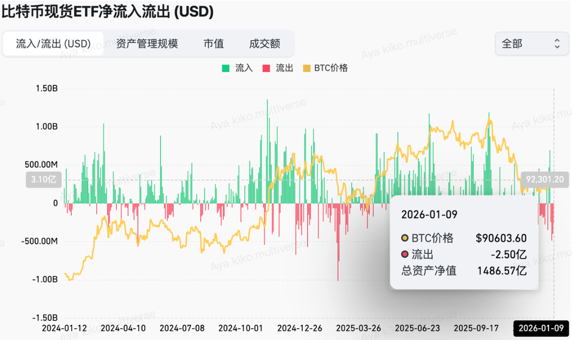 据统计,在1月4日-1月9日期间,美国比特币现货ETF净流:6.81亿美元;截止到1月9日,GBTC(灰度)共计流出:253.65亿美元,目前持有147.11亿美元,IBIT(贝莱德)目前持有702.49亿美元。美国比特币现货ETF总市值为:1205.62亿美元。