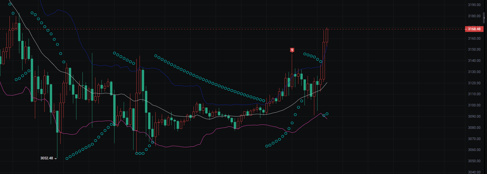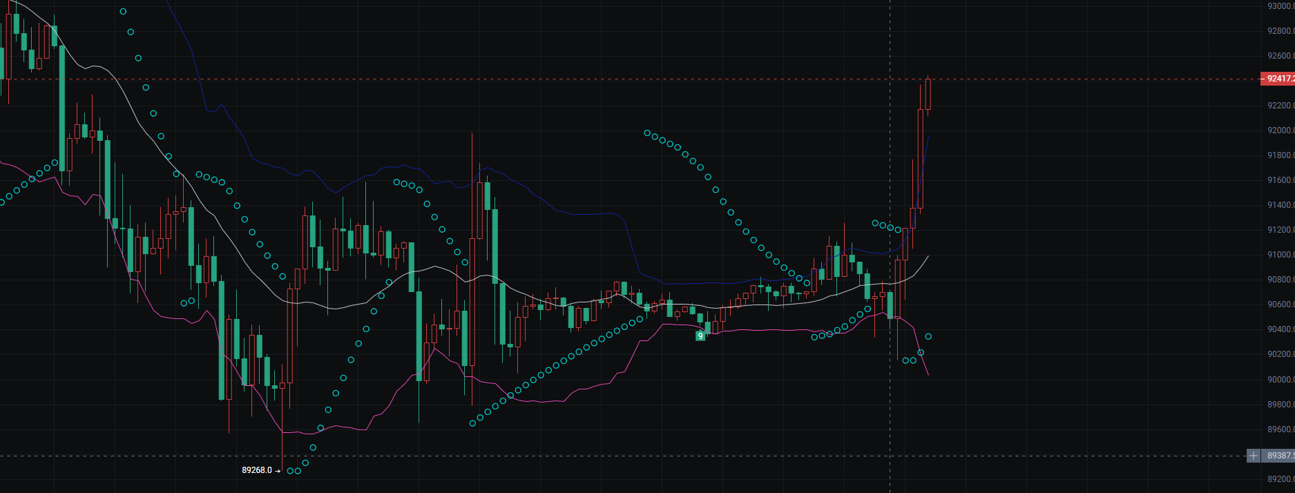 1. 趋势与形态 价格先下探至8926.0低点后触底,走出快速V型反转,近期以大阳K线放量突破关键阻力位9247.7,短期多头趋势明确,属于典型的超跌反弹+趋势反转形态。 2. 指标信号 图中均线/轨道类指标(彩色曲线+圆点)显示,价格快速上穿多根指标线,虽短期指标存在偏离(价格远高于指标线),但指标拐头向上的趋势未变,多头动能暂未衰竭。 3. 关键位与操作要点 ◦ 支撑位:9247.7(原阻力转化为即时支撑),其次是9100区间(前期震荡平台上沿); ◦ 压力位:上方关注9300整数关口及前期高点9300 - 9350区间; ◦ 风险提示:短期涨幅过大,若回踩9247.7支撑失守,易引发获利盘回吐,需警惕回调风险;若站稳该支撑,多头将继续向高位冲击。