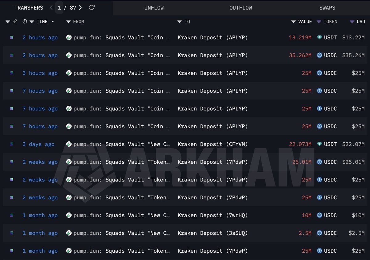 Pumpfun(@Pumpfun) 在过去7小时内又向 #Kraken 存入了148.48百万美元的稳定币!